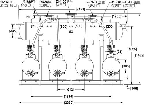 凝結水回收機組 型號:QJ-101-4 重量:750kg 最高允許壓力及溫度:1.0Mpa/210℃ 最大工作壓力:0.85Mpa 最高工作溫度:200℃接口法蘭標準:HG/T20592PN1.6 外形尺寸:見技術方案 |
