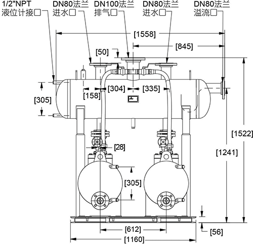 凝結水回收機組 型號:QJ-101-2 重量:280kg 最高允許壓力及溫度:1.0Mpa/210℃ 最大工作壓力:0.85Mpa 最高工作溫度:200℃接口法蘭標準:HG/T20592PN1.6 外形尺寸:見技術方案 |