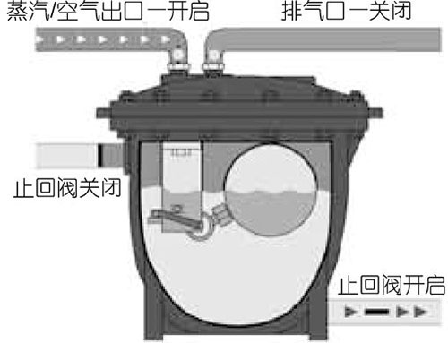 2.浮球隨著凝結水的流入而上升至排水點,聯動機構動作到高位,動力汽(氣)進入,泵內帶壓,閥門全部處于第一步的相反位置。