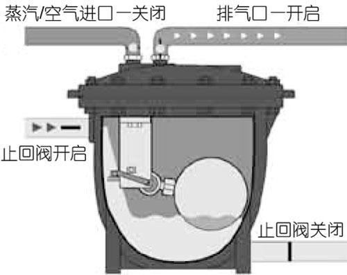 4.蒸汽空氣進口及泵出口止回閥重新關閉,排氣口和進口止回閥開啟,于是又進入充水狀態,重復動作過程。