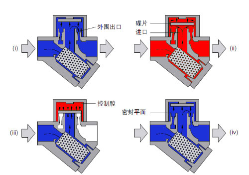 在啟動階段,由于壓力的作用,碟片被頂起,冷凝水和空氣越過內側閥座經碟片下部從外圍出口的三個小孔排出(見圖i)。高溫的冷凝水經過入口,進入到閥腔碟片的下部后壓力下降,產生閃蒸蒸汽并以高速流動。由于速度升高,所以碟片下壓力降低,把碟片拉向閥座(見圖ii)。同時一部分閃蒸蒸汽進入到碟片上面的腔體內,產生的壓力克服冷凝水向上的壓力把碟片壓在內外側閥座上,此時閃蒸蒸汽被封存在碟片的上部,碟片上面的壓力和下面的壓力相平衡,但因為上面的作用面積比較大,作用在碟片上面的力要大于碟片下面的力。最后,當碟片上部腔體內的閃蒸蒸汽冷凝后,在下部冷凝水的壓力下碟片被頂開此重復循環。